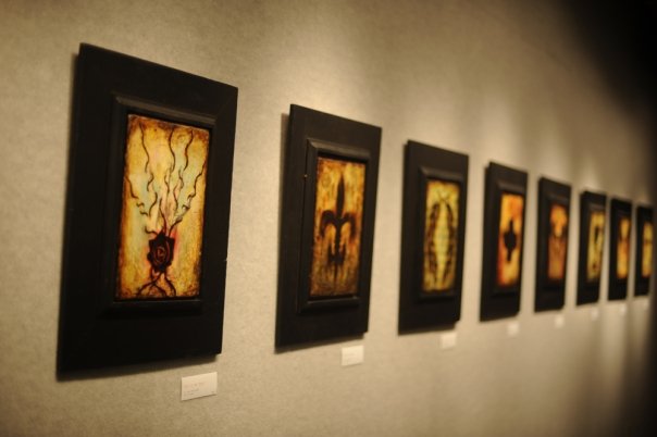 The paintings -- brimming with coffee, amber and blood-red colors tempered by teal green -- glow like embers in the gallery's low light.