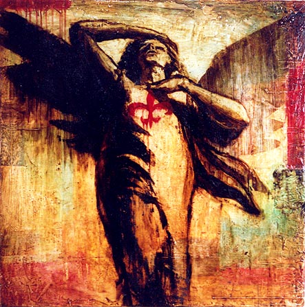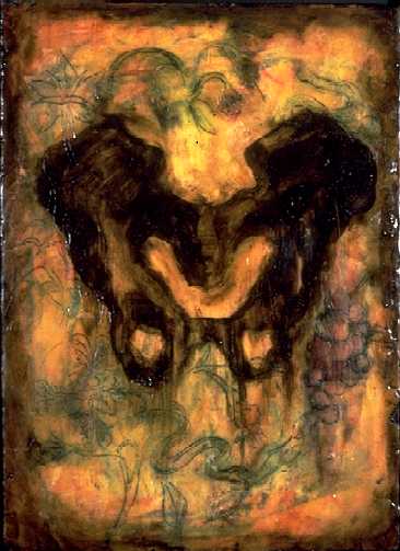 "Merrymaking of Loss", 16" x 12", oil, wax, tar, on wood, $1200