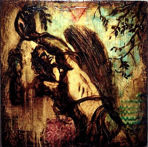 Alchemy of Forgiveness 2001 oil, beeswax, tar, collage on wood construction 24"high x 24"wide x 4"deep