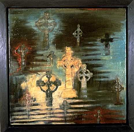 There's something decidedly 19th century about Dan Addington's 23 paintings, mostly on panel, at the Contemporary Art Workshop, despite their shapes floating in disembodied space and the occasional collaged fragment of a photocopy. Not only does the mood evoke the nostalgia of Caspar David Friedrich paintings of ruins, the images seem to express an unfashionable straightforward belief in the symbolic power of objects. The large dark brown Celtic cross at the center of Muireadach's Cross (pictured above) floats in a luminous field of smeary yellow green and appears to be dripping pigment in a kind of painterly blur that recalls Jasper Johns. Like most of Addington's paintings, this one is covered with a thick layer of beeswax, which adds a peculiar sense of age and ambiguous depth: this complexity, together with a heavy black frame, gives the dark, solid cross an odd power that belies the modernist artifice of the dripping paint. In Congregate, Celtic crosses of various sizes float against an abstract ground that varies from pale blue-green to red; the crosses seem adrift in space, now confined to a flat surface, then becoming objects in space again, seeming almost animated, alive. Addington, 33, a Chicagoan, cites painterly influences from Jim Dine and Larry Rivers to Rembrandt and Caravaggio, but this series has its roots in a trip to Ireland last year, when he spent two weeks driving around looking at ruins. "In continental Europe," he told me, "many of the Gothic cathedrals are still being used, still beautiful, still kept up. In Ireland you go into cathedrals and you're still outdoors, because they're ruins. Or you can be out in the middle of nowhere and come up over a hill and there's this 12-meter-high sandstone cross with intricate carvings. It's still a mystery as to what their purpose was. But I've read some about Celtic Christianity: it had more of a connection to the land and to earlier Celtic mythology. Celtic Christianity has a real ecological theme. St. Patrick's writings constantly make reference to the land and nature." At the same time, he says, the ruins exuded "a kind of melancholy. There's a sense of sadness in the landscape too - it's drizzly or raining...you hear the wind." Addington also looked at illuminated manuscripts - he mentions the most famous, the Book of Kells - and though he says he didn't want to put them directly into his paintings, they still seem to be an influence. Plant shapes at the edges recall the ornate borders of manuscript pages, and pale horizontal lines near the center suggest rows of text. Shamrock shapes, which appear as often as crosses, recall the way plant forms often adorn the middle of the text as well. In Beyond the Pale, one of five large paintings here, these and other elements converge to form a shifting dreamworld of belief and loss. A thin, dark band at the bottom depicts a silhouetted landscape of trees and a tower, giving the picture a literal ground, but most of it is a free-floating field of changing colors and somewhat defined shapes. Crosses, shamrocks, a pinkish set of elongated hands whose position suggests prayer or pleading, and a dimly outlined double serpent are defined by pale lines and colors always on the point of being reabsorbed into the amorphous surface. Though these shapes have an iconic power, it's qualified by abstraction, which creates a distance between the viewer and the beliefs the symbols evoke. The decayed-looking surface also adds distance, as if these forms were being reintegrated with nature. A group of smaller, more realistic landscapes, oils without a wax covering, reveal an even greater debt to 19th century romanticism. In Drumcliff a carved Celtic cross towers over an abstracted landscape whose horizon shows the pale orange of dawn or dusk; in Ceiran's Garden we see a field of crosses against a dark sky. In both paintings the crosses have some distinct details but are hardly photographic, and together their relative lack of detail and the dominating indistinct sky suggest that the painter's nostalgia for faith is as much a subject as faith itself. Addington, a Christian, has managed to create paintings whose mournfulness suggests both belief and loss: belief in a world in which symbols still have meaning, and acknowledgment that the withering away of tradition has distanced us from their power.