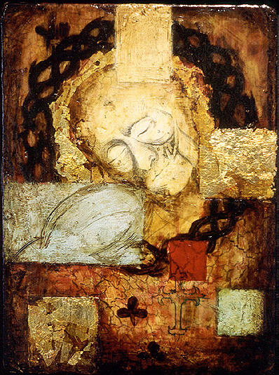 oil, beeswax, tar, collage on wood panel