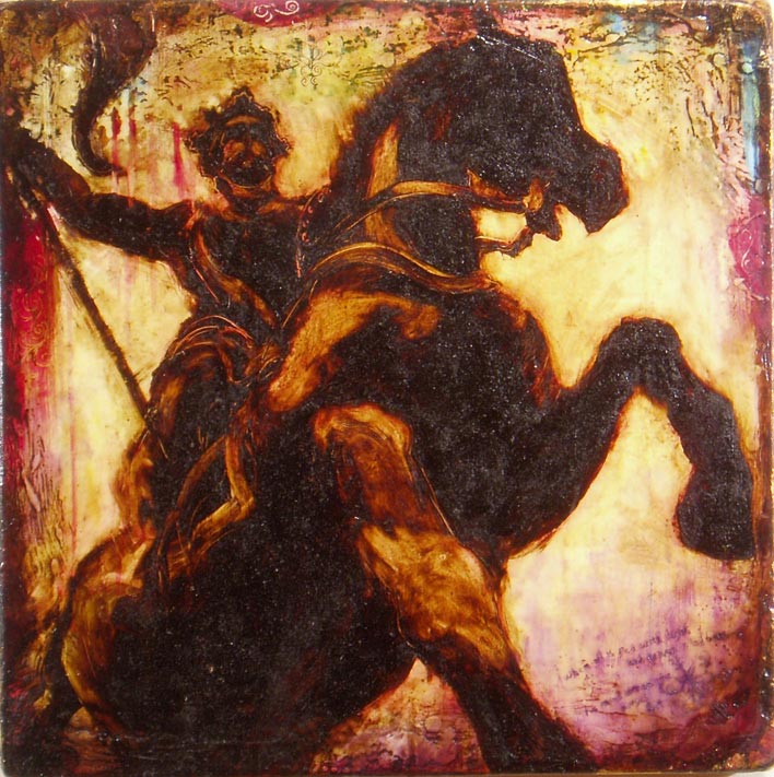 oil, wax, tar, collage on wood